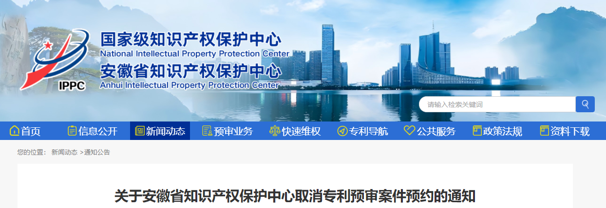 关于安徽省知识产权保护中心取消专利预审案件预约的通知