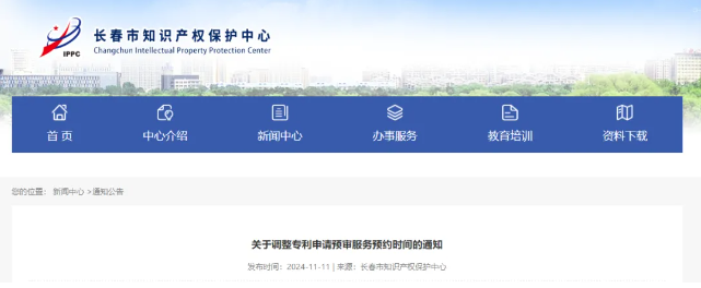 为保障预审资源的有效使用,提供更优质的专利预审服务。自2024年11月18日起,长春中心将专利申请预审服务预约周期调整为两周一次,预约时间为每周期的第一个工作日上午9点(节假日顺延)。望各单位严格遵守长春中心《预审服务管理办法》的相关规定,确保预约专利预审请求前完成专利申请的各项准备工作,不得出现预约后无故不提交案件的情形。