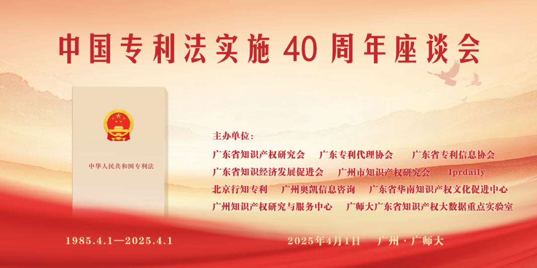 2025年4月1日,在珠江之畔,一场由广东省知识产权研究会等单位主办的聚焦中国专利法发展历程与未来走向的活动——“中国专利法实施40周年座谈会”即将启幕。