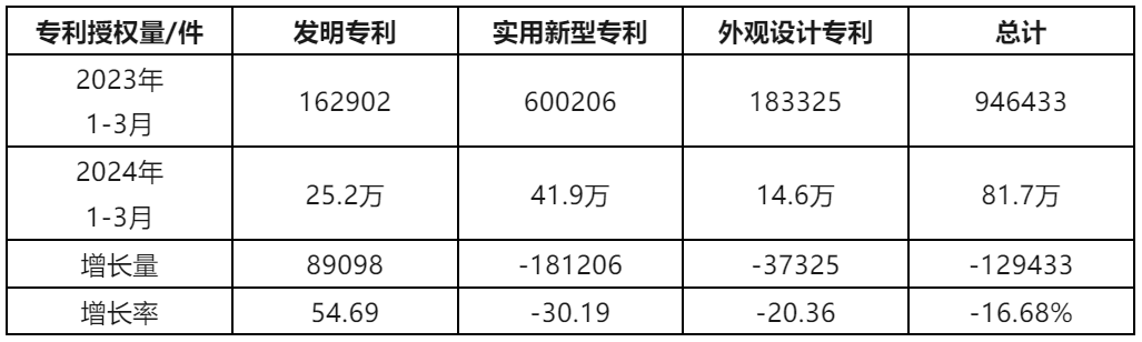 导读:近日,国家知识产权局发布了2024年1-3月知识产权主要统计数据快报。相较于2023年1-3月,发明专利授权量同比增长54.69%(增长量为89098件),实用新型同比下降30.19%(下降181206件),外观设计同比下降20.36%,总计同比下降16.68%(下降129433件)。