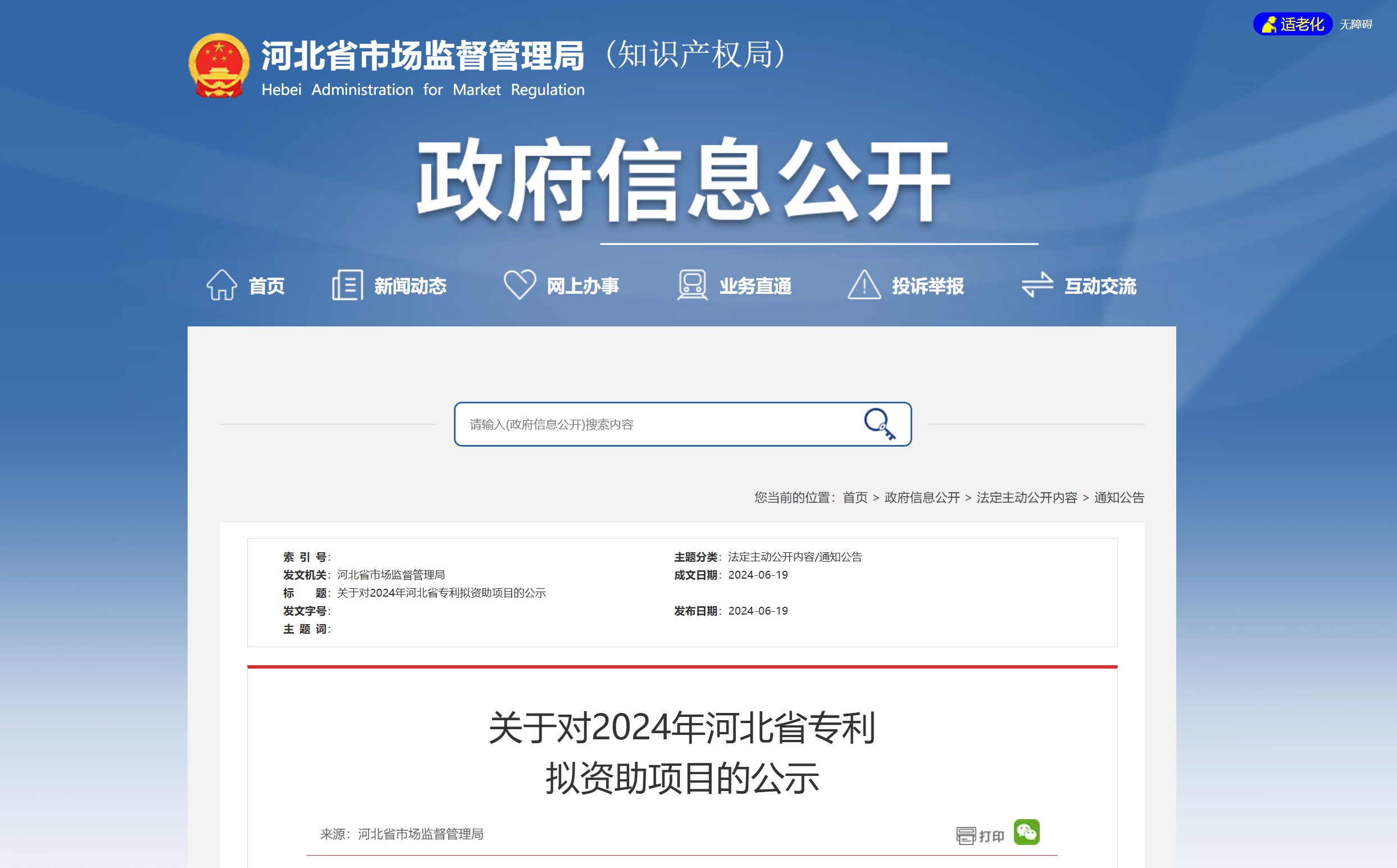 河北省市场监督管理局对163项PCT授权发明专利、976项国内授权发明专利,共计1139项拟资助专利项目及额度进行公示,公示期自6月19日至6月27日止。